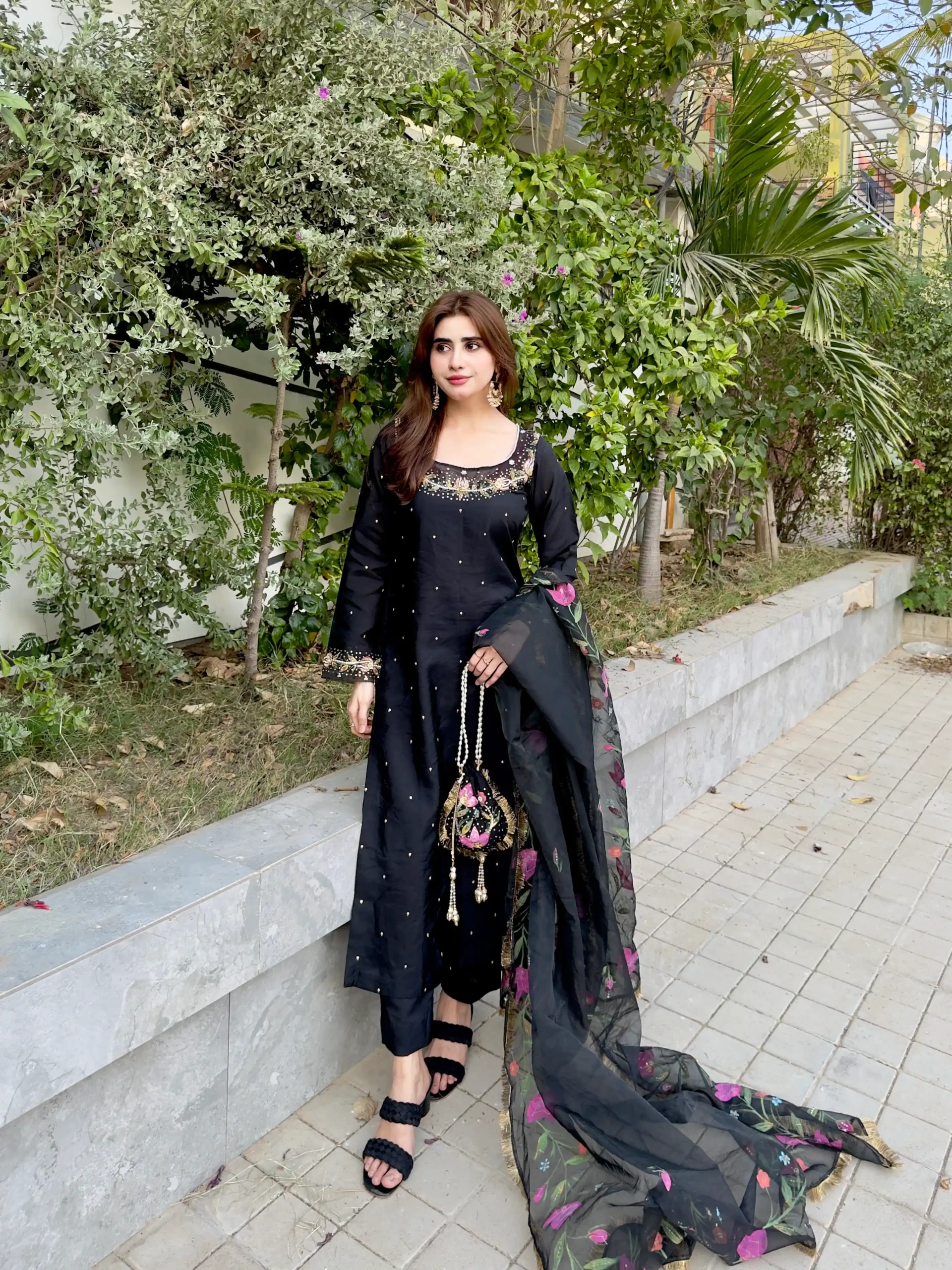 Trouser Sheesha Silk , Potli, Dupatta Organza Handpaint With Embellished