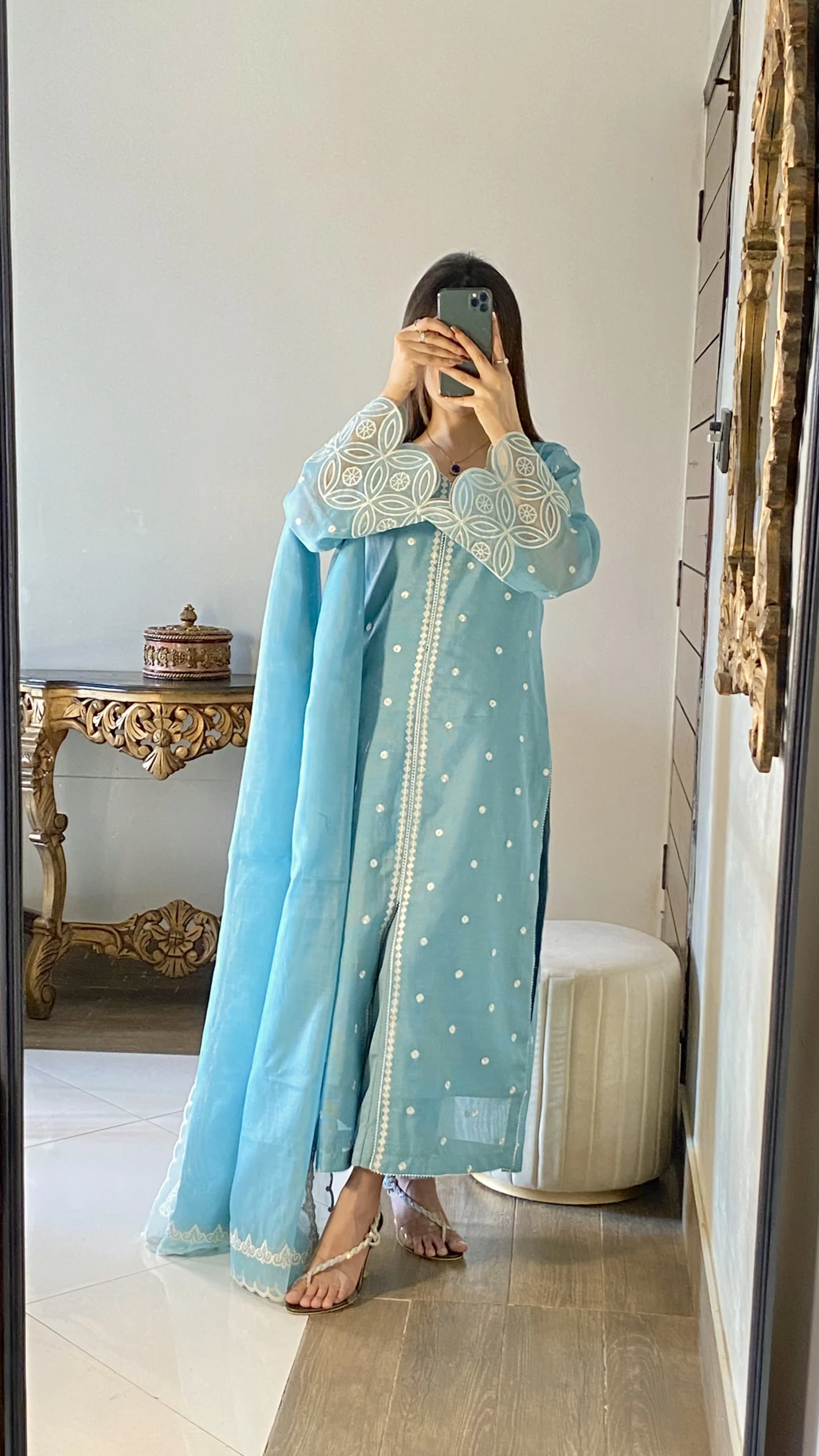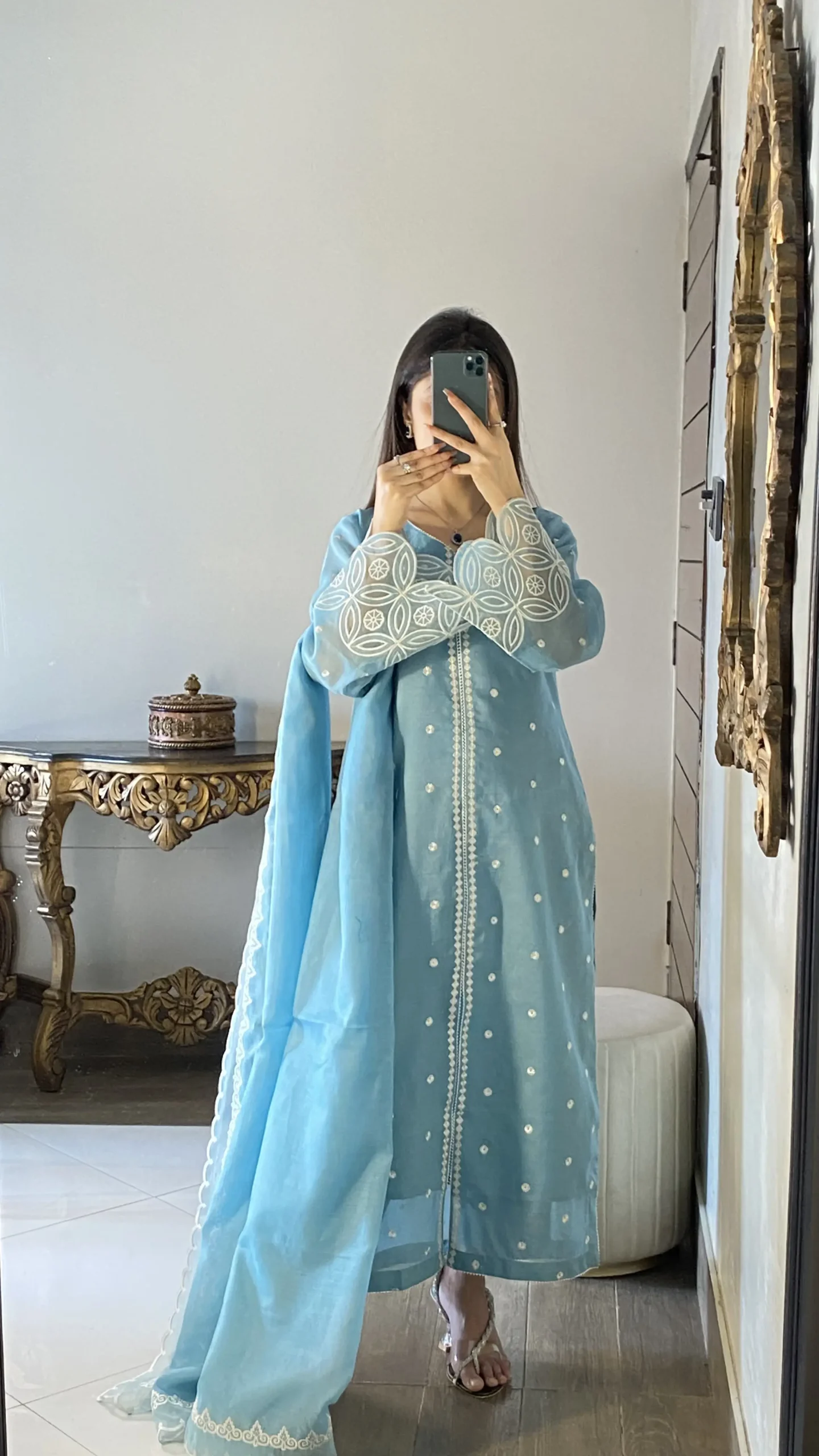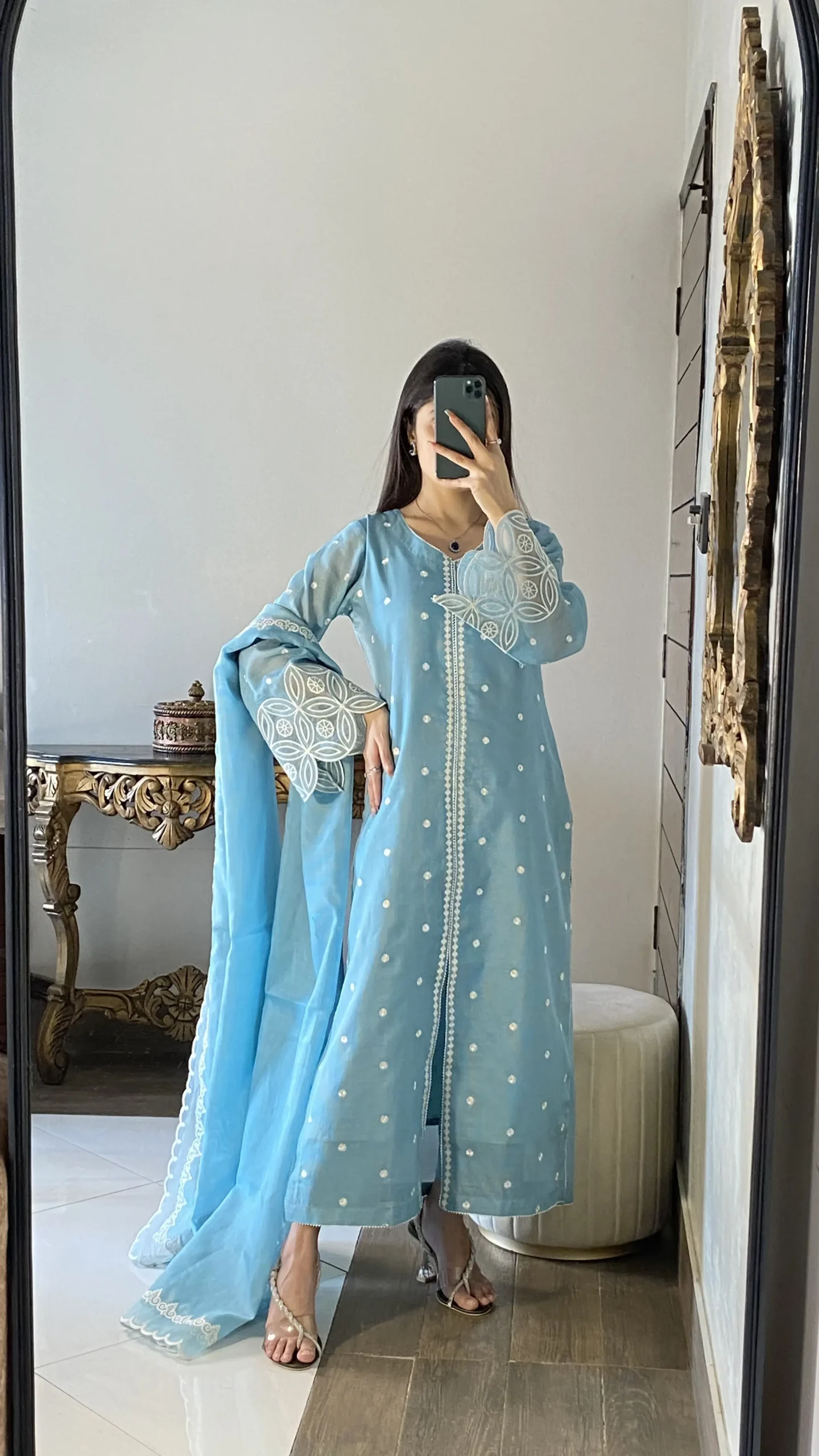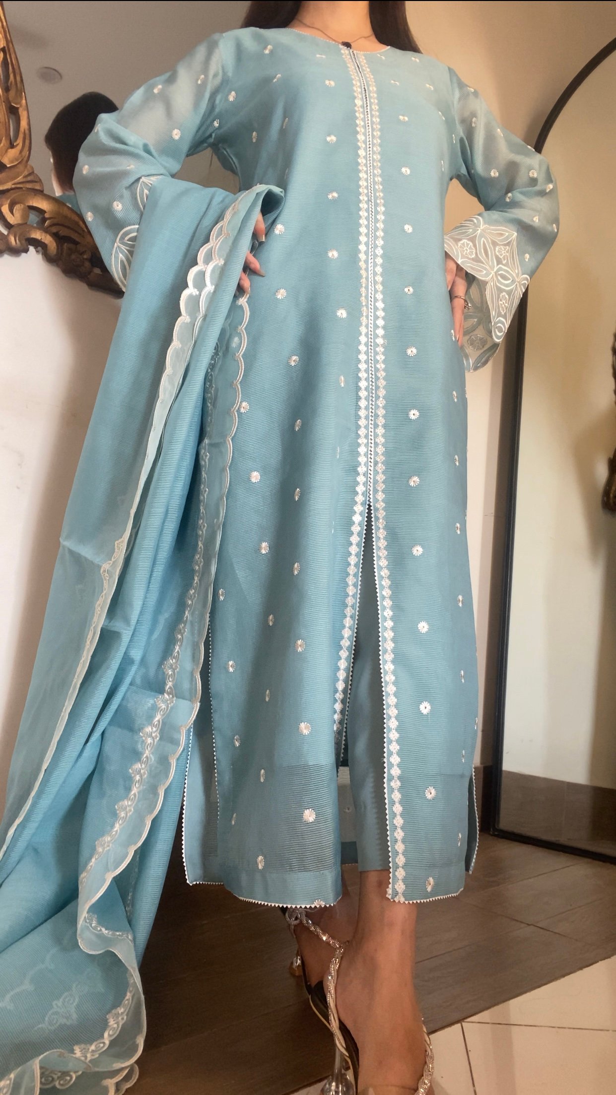 Fabric details: Khadi currenty net simple thread work with laser applique dupatta Stitched 3pc